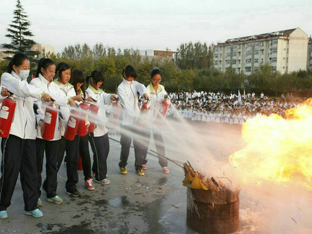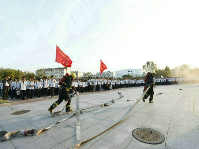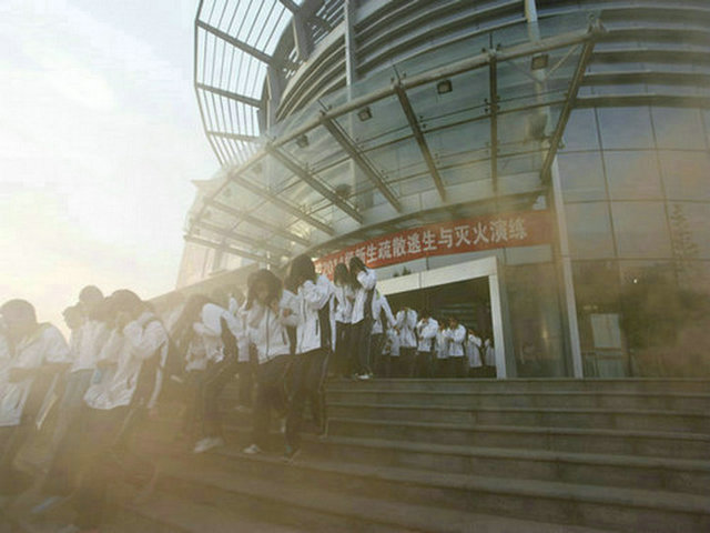 为增强2014级新生防控火灾的意识和能力,有效预防和减少火灾事故发生,我校于10月18日下午,在王营校区图书馆楼前举行了2014级新生及相关岗位教职工参与的灭火逃生演练。