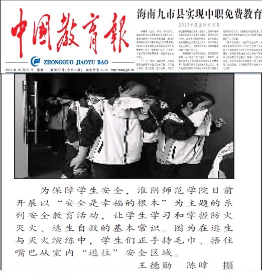 10月31日,【中国教育报】7板刊登了淮阴师范学院开展系列安全教育活动——疏散逃生灭火演练。全文如下:为保障学生安全,淮阴师范学院日前开展“安全是幸福的根本”为主题的系列安全教育活动,让学生学习和掌握防火灭火,逃生自救的基本常识。图为在逃生与灭火演练中,学生们正手持毛巾,捂住嘴巴从室内“逃往”安全区域。