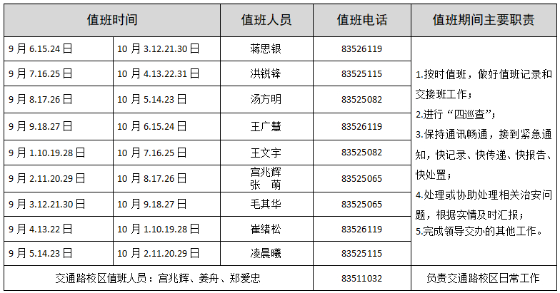 保卫处2025年9-10月份校园“110”值班室干部值班表