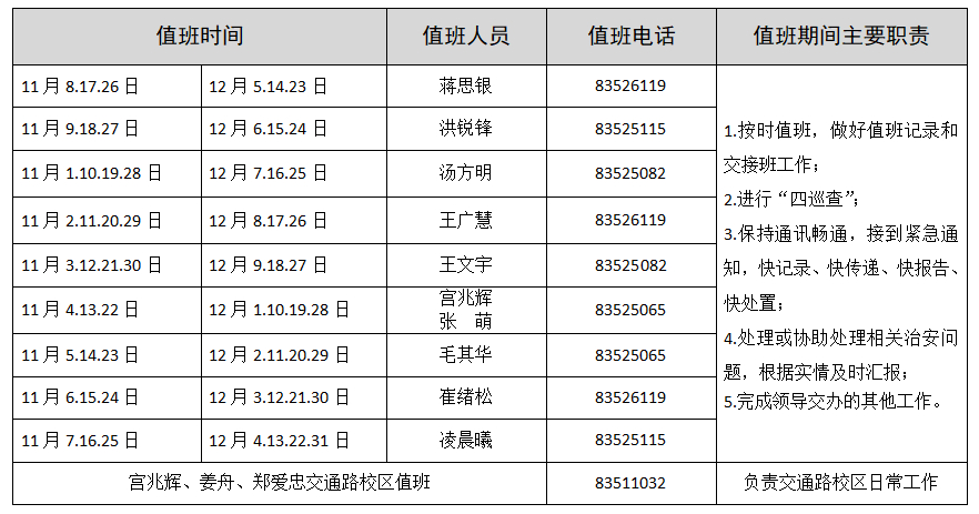 保卫处2025年11-12月份校园“110”值班室干部值班表